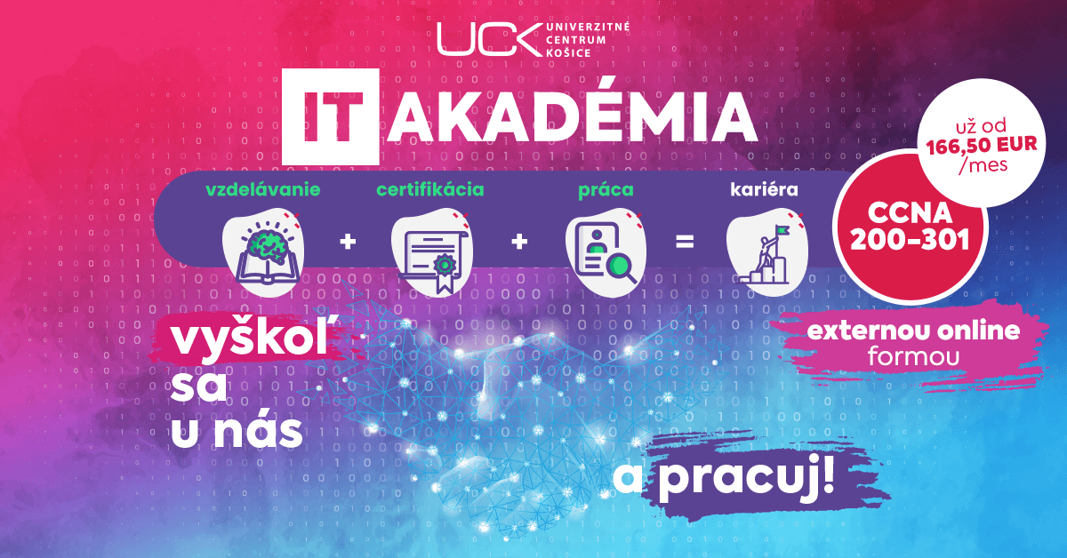 Naše vzdelávanie centrum ponúka projekt IT Akadémia so zameraním na Cisco sieťové technológie level CCNA. Nadobudnuté vedomosti a medzinárodná certifikácia Vám môžu pomôcť pri získaní zamestnania v spoločnostiach zaoberajúcimi sa sieťovými technológiami.